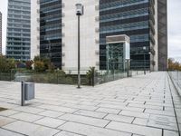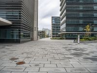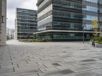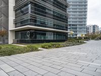 A view from a high-rise tower of a modern business district in Lisbon, Portugal. The scene includes a condominium property with a skyscraper, a road surface of asphalt, and a curb of composite material. A variety of vegetation including trees and grass surround the open public space and the modern architecture of the residential area.