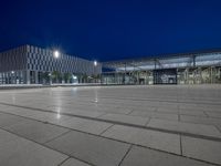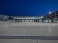 A view of an open plaza with modern architecture and artificial light in Berlin, Germany, at night. An urban surface of concrete and asphalt, with a Hinterhof and a clear sky, can be seen straight down the road.