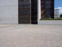A modern cityscape in Berlin, Germany featuring a mix of urban architecture, open spaces, and diverse road surfaces including concrete, asphalt, cobble stones, dirt, gravel, and grass. The daytime view includes buildings, windows, walls, floors, wood flooring, doorways, driveways, walkways, plazas, public spaces, courtyards, and more.