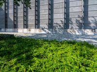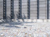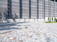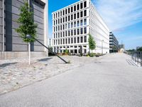 The modern architecture of a city neighborhood in Berlin, Germany is illuminated by the sunlight. The concrete, brick, and cobble stone roads surface and the green vegetation of the trees, grass, and leaf provide a striking contrast to the facade of the property and houses along the straight road.