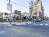 A view of the urban architecture in downtown Chicago, Illinois, with low residential buildings, mixed-use properties, and open spaces.