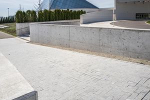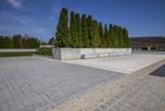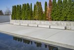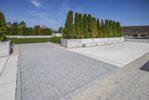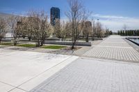 A view of the city's architecture and road surface with concrete and asphalt, surrounded by residential areas and trees on a winter day. The straight road leads to a public space with a walkway, lined with trees and a boardwalk. The urban design showcases various houses with different facades and roofs, reflected in the water. A guard rail and handrail can be seen along the road, while a memorial stands in the neighborhood. This real estate offers a coastal location for recreation, with contrails in the sky.