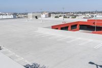 A view of the city skyline showcases the modern architecture of the urban landscape, including a parking deck, a stadium, and a parking lot surrounded by asphalt roads and a clear sky.