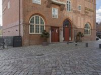 A classic office building with brick walls and a cobblestone walkway in the art district of HafenCity, Hamburg, Germany.