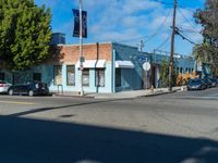 A view of the urban architecture in Los Angeles, California, USA. The cityscape showcases various buildings, houses, and residential areas. The asphalt roads and road surfaces provide a smooth path for vehicles. The clear sky and trees add to the picturesque scene, while the storefronts, warehouses, and shops contribute to the bustling urban design. The tints and shades of the buildings create an artistic atmosphere in the art district. The presence of vehicles, street lights, and electricity highlights the dynamic nature of this neighborhood.