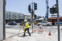 A view of the cityscape and urban infrastructure in Los Angeles, California, USA, showcasing the bustling city life and business district with office buildings and construction work taking place on the asphalt roads under a clear sky.