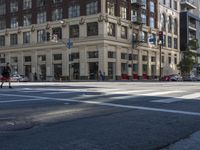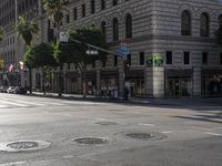 A view of the vibrant cityscape in Los Angeles, California, USA, showcasing the classic architecture and urban design in this metropolitan area. The photo captures a mix of buildings, roads, and public spaces, with pedestrians and vehicles moving along the asphalt lanes. The hard shadows create a striking contrast against the sunny day, while the foreground features a tree-lined open space. This image represents the dynamic city life and infrastructure of Los Angeles.