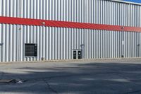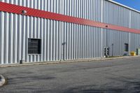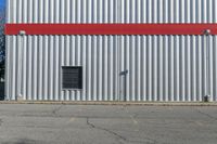 the large steel building has red and silver walls on it's sides, while other windows have been put in