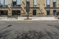 a building with windows and trees on a street in front of it with snow and no leaves