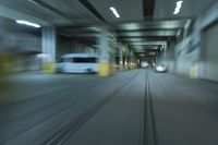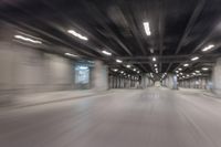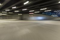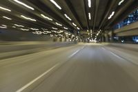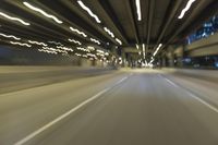 A night-time shot of a road running through Chicago, Illinois, USA. The view is straight down the road with yellow lines and artificial light creating motion blur. The concrete street is lined with buildings and nonbuilding structures, like parking lots and subway tunnels, creating a metropolitan atmosphere.