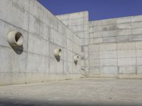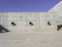 A modern architecture structure in Zaragoza, Spain. The building showcases a combination of composite materials and concrete walls, creating a unique facade. The clear sky and low angle of the sun cast hard shadows, adding depth to the urban design. The road surface and concrete street lead towards the museum, surrounded by an open space with trees and landscaping. The symmetrical composition and grey tones give a contemporary feel to this architectural masterpiece.