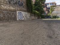 A view of a residential alley-way in Berlin, Germany showcases the city's unique urban art. The stone wall, grey building, and concrete flooring are illuminated by the azure sky, while the grass, gravel, and vegetation add tints and shades to the landscape. Graffiti, paint, and handwriting adorn the walls, creating a vibrant, one-of-a-kind atmosphere in this Hinterhof.
