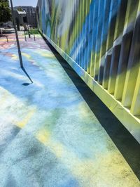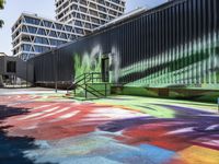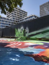 The city of Berlin, Germany is home to unique modern architecture, art galleries, and vibrant public spaces. In this photo, the colorful art gallery of an urban Hinterhof is illuminated by sunlight, with a blue sky and metal fence in the background.