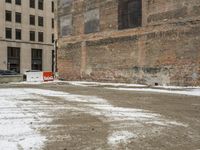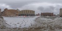 A view of an off-road track in the city of Detroit, USA, on a freezing winter day. Snow covers the asphalt, trees, brick walls, and building facades, while a cloud-filled sky looms overhead.