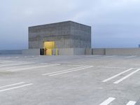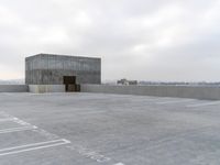 The Brutalist architecture of a corporate headquarters creates an artificial skyline against the winter horizon, with concrete facades, ice-covered trees, and streetlights illuminating the cityscape and its energy-producing infrastructure.