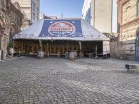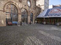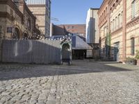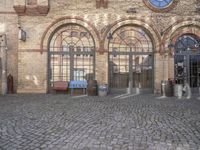 A classic brick building with an arched entrance stands in the courtyard of a neighborhood in Berlin, Germany. Cobble stone flooring, trees, and open space make it an ideal spot to eat out, take a vacation, or explore the city life and urban design of this historic European capital.