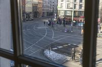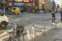 A scenic view of Berlin, Germany, showcasing the city's urban design with a winter backdrop. Trams roll along the asphalt roads, passing by buildings and open spaces. The city's architecture and infrastructure create a vibrant atmosphere, with street lights illuminating the neighborhood. Pedestrians cross the road using the zebra crossings, while bicycles and motor vehicles navigate through the clear sky. The elevated tram line adds a unique touch to the residential area, surrounded by trees and facades of buildings. The composite material flooring and wooden shades provide a cozy and inviting environment for the cafe-goers.