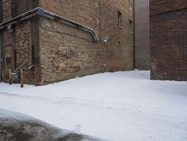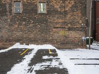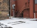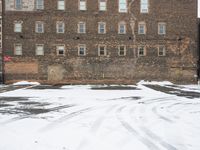 A packshot of a brick wall facade in a residential area of Detroit, USA. The road surface is covered in snow and ice, and a tree can be seen in the reflection in the window. A blizzard brings a wintery atmosphere to the urban city and its infrastructure.