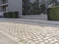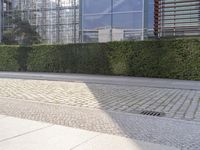 A modern office building in a bustling business district of Berlin, Germany, with its grey brickwork, tar roads, vegetation, and other features of urban design.