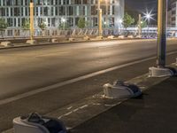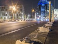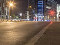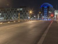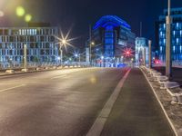 A bustling business district in Berlin, Germany is illuminated by artificial light at midnight. The cityscape features a modern mix of architecture, infrastructure, vegetation, and public space, highlighting the tire tracks of a truck on the asphalt road surface and a bridge in the horizon.