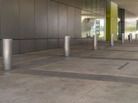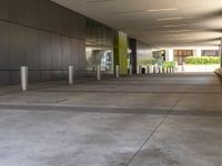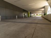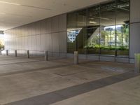 A modern office building against a concrete city surface in the business district of California, USA, seen from a one quarter profile angle on a sunny day.