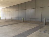 A modern office building in a bustling city, illuminated by the hard shadows of the afternoon sun, showcases the concrete surface and urban design of California's business districts.