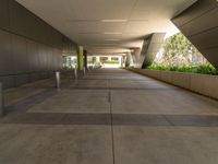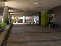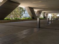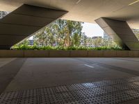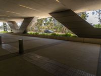 A modern office building stands out against a clear sky in a thriving business district in California, USA. This one quarter profile view of the concrete surface and urban design gives a glimpse of city life straight down the road.