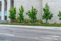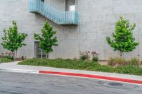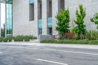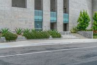 An asphalt road lined with office buildings in the business district of Los Angeles, California, USA on a sunny day. The modern architecture and urban design of the city is complemented by the concrete surfaces.