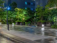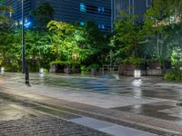 The city street lit up with artificial light, wet from recent rainfall, featuring an office building and paver road.
