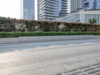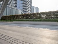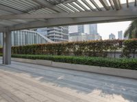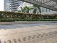 A clear day in Shenzhen, China reveals a bustling business district filled with modern architecture, urban design, infrastructure, and nonbuilding structures like bridges and skyways. Pedestrians make their way through a plaza filled with vegetation, trees, and a parking lot, while a concrete bridge and pergola provide a fixed link between a residential area and the metropolitan area. Asphalt and pavers line the roads and walkways, and a botanical garden provides shade and a hedge for the buildings and skyscrapers.