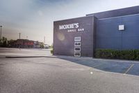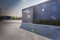 This stock photo features an urban business district in Toronto, Ontario, Canada. The photo showcases the architecture of office buildings, storefronts, and residential areas. The clear blue sky and sunlight create a vibrant atmosphere. The road surface and concrete curbs add a touch of urbanity to the scene.