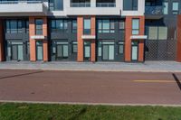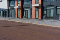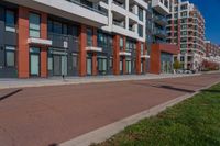 A straight road surface with asphalt leads through the urban business district in Toronto, Ontario, Canada, lined with high-rise office buildings and condominiums. The clear sky and vibrant vegetation add to the charm of the city.
