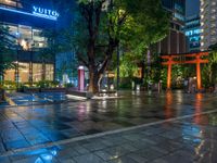 A wet road in the city business district of Nihonbashi in Tokyo, Japan, illuminated by artificial light at night and lined with office buildings, shops, and store fronts.