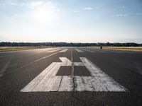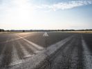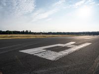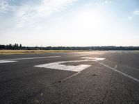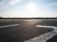 A tranquil dawn in the city of Berlin, Germany. The clear sky is lit up by the sun, casting a warm glow on the asphalt road surface, the public infrastructure and the green trees and grass. In the distance, the landmark of Tempelhof airport stands tall, a reminder of the city's history of air travel and agriculture.