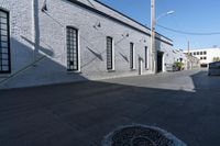 A low brick building in an urban residential area, with asphalt roads, open space, and a clear sky. The facade has windows, high infrastructure, and a road surface. Shadows and public spaces create a unique curb and urban design, with grey concrete, tar, street lights, and electricity. A brick wall is elevated, creating a hard shadow and a slope.