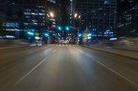The modern architecture and infrastructure of downtown Chicago, USA is illuminated by artificial light and highlighted with a light streak from a passing car, creating a symmetrical composition of the urban cityscape.