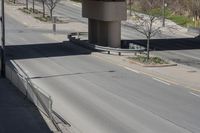 Aerial view of a high-rise residential area in Toronto, Ontario, Canada. The city streets are lined with asphalt roads and grey sidewalks, while trees and vegetation bring shade and greenery to the urban landscape. The architectural structures and buildings are made of various materials including wood, concrete, and metal. The elevated bridge with its hard shadows creates an interesting architectural element. This vibrant city showcases a harmonious blend of urban design, infrastructure, and natural beauty.