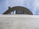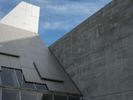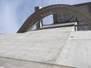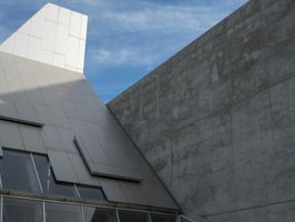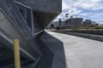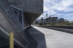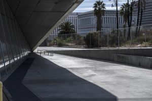 A modern architecture building facade with a road surface of asphalt and concrete, a wood floor, a roof, a walkway, and a white wall in the residential area of Los Angeles, California. This metropolitan area is known for its thriving infrastructure, transport, recreation, and property.