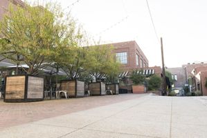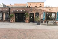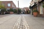 A low, concrete paver road stretches straight down the city's brick wall, leading to an open urban space beneath a clear sky.