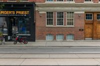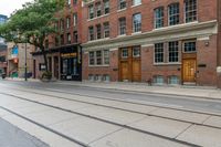 A bustling urban city street with asphalt road and brick buildings in Toronto, Canada.