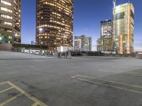 A view of a metropolitan area, with high-rise buildings, a parking garage, condominiums, and other residential areas illuminated by artificial light and the early morning dawn sky.