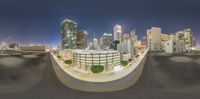 A view of the concrete and asphalt roads of a metropolitan area at dawn, with high-rise buildings, condominiums, parking garages, and a skyline of skyscrapers in the background