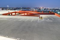 A view of the urban cityscape at dawn, with its concrete and asphalt surfaces, wood flooring, fixed link structures, parking garage, stadium, highway entrance, exit, ramp, and incline in the foreground and a clear sky in the background.