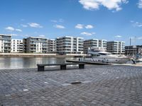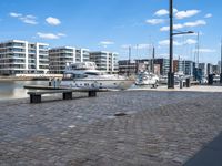 The city of Bremen, Germany, is a unique blend of modern architecture, high-rise buildings, and historical sites. From the pier, one can see the clear sky, the cobblestone road, and the many boats in the harbor. The horizon is dotted with residential buildings, and the street lights bring a feeling of city life. This is a peaceful view of the urban design of Bremen, Germany, during the day.