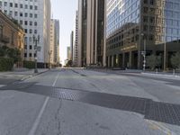 A view straight down a city road with asphalt lanes and metropolitan infrastructure in the background of an urban neighborhood on a clear day. Automobiles are seen driving by in the foreground with a city skyline visible in the distance.