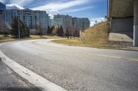 A view of an urban cityscape with a curved road, lined with trees and surrounded by buildings. The skyline of the city can be seen in the background, against a clear blue sky.