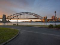 A stunning urban cityscape at dawn with a tied-arch bridge over a river, surrounded by lush vegetation and a road surface.