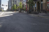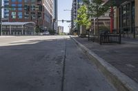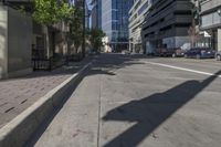 A view of the modern architecture and city life in downtown Denver, Colorado, USA, with straight roads, concrete infrastructure, and bustling urban design.