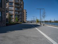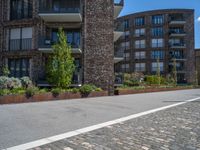 A vibrant urban cityscape captured in Germany. This photo showcases the modern architecture and urban design of a residential area. The clear sky complements the sleek lines of the buildings and the cobblestone road. The asphalt surface and brick walls add a touch of texture to the scene. Perfect for illustrating city life and the beauty of European urban landscapes.