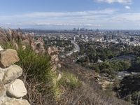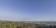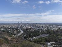 Aerial view of a metropolitan area in Los Angeles, California, USA with modern architecture, skyscrapers, trees, hills, mountains, and coastal shores. The city skyline overlooks a human settlement, residential area, and natural environment with a blue horizon.